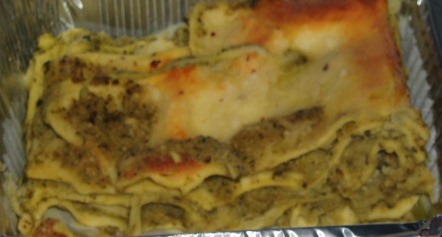 - In una teglia rettangolare 30×20 versare due mestoli di besciamella al pesto, sovrapporre due sfoglie, versare altra besciamella, cospargere di parmigiano e una manciata di mozzarella. A piacere aggiungere dei pomodorini tagliati a metà (o anche quadrotti di patate lesse o fagiolini). Formare in questo modo almeno tre strati e terminare gli ingredienti.