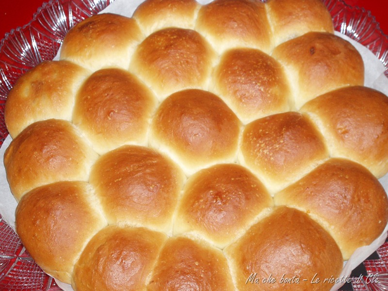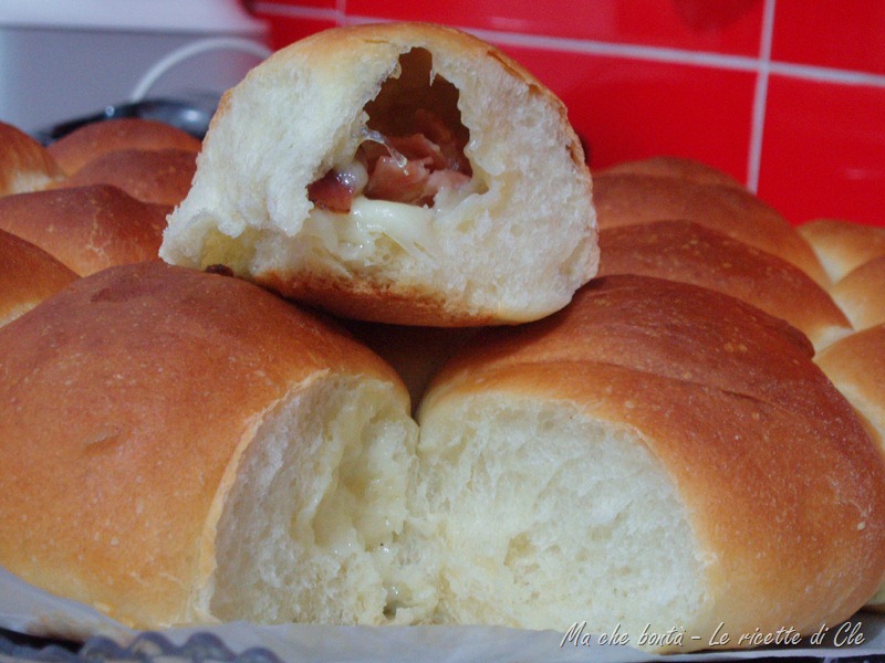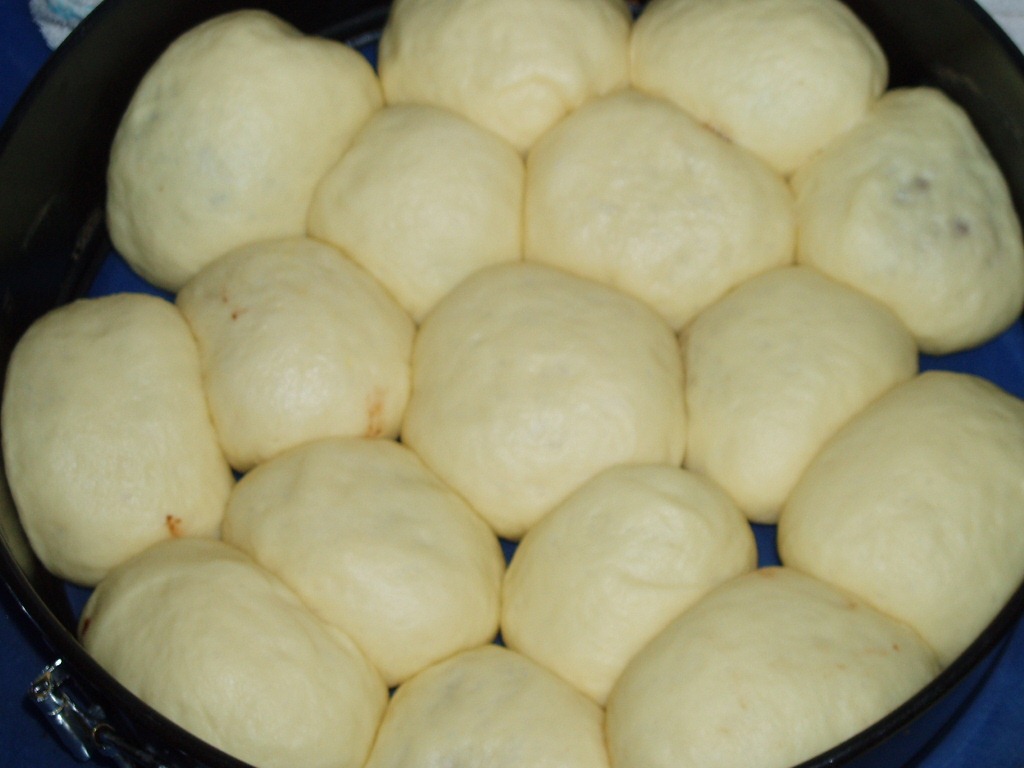 Fare l’impasto con la farina, olio zucchero, l’uovo intero, il latte tiepido in cui avete sciolto precedentemente il lievito e lo zucchero, alla fine unite il sale. Formate una palla e lasciatela lievitare un ora e mezza circa. Quando è lievitata, tirare l’impasto in un filoncino e dividetelo in 16 pezzi, schiacciare col palmo della mano ciascun pezzo, farcitelo con il ripieno prescelto e poi chiudetelo con un pizzicotto (mettete la parte pizzicata a contatto con la base dello stampo). Una volta create le 16 palline disponetele vicine ma non attaccate in una teglia a piacere (io ho usato una tonda da 26 cm di diametro), lasciatele lievitare di nuovo per 1/2 ora. Passata la mezz’ora le palline, crescendo, si saranno attaccate fra di loro. Spennellate con il tuorlo ed infornate a 180° per circa 30 minuti.