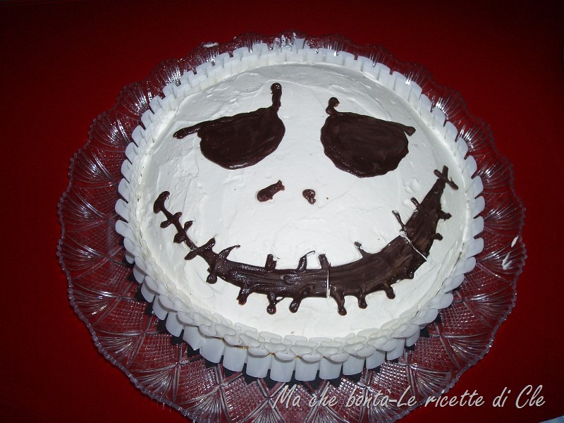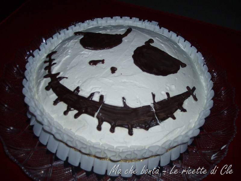 La base è quella della torta sacher, bagnata con latte zuccherato, mentre per la farcia ho usato la crema al cioccolato bianco e philadelphia. Sulla superficie della torta invece ho spatolato panna montata. I particolari della faccia invece sono semplice cioccolato fondente: ho disegnato su carta da forno la facciona di Jack prima con una matita e poi con il cioccolato, ed applicato occhi, bocca e narici, una volta raffreddati, sulla torta.