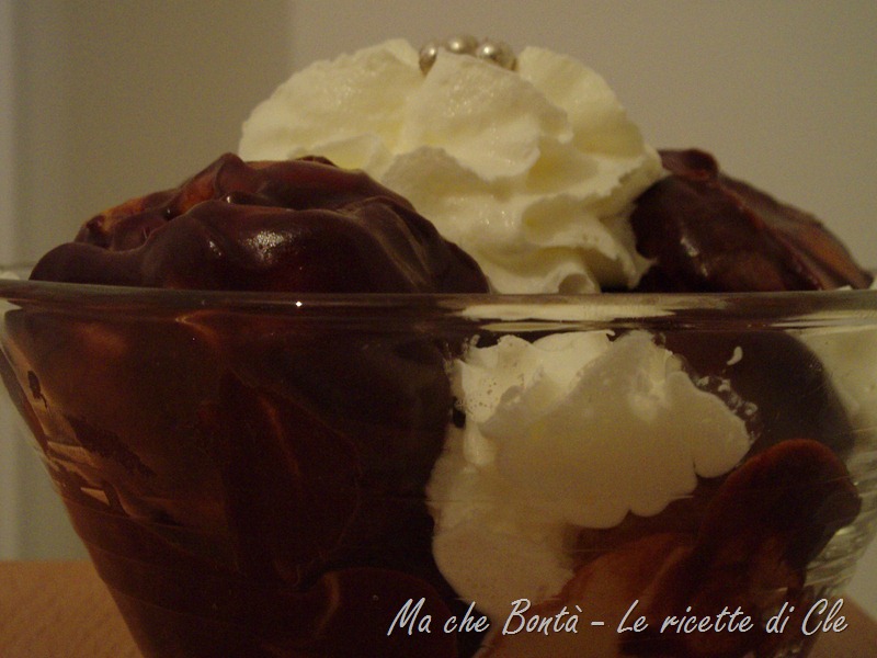 Fondere 200g di cioccolato con 200ml panna (fresca o vegetale) a bagnomaria. Aromatizzare con il proprio liquore preferito o con delle spezie. Lasciar raffreddare in modo che raggiunga una consistenza adatta a glassare i bignè. Se dovesse indurirsi troppo scaldare leggermente a bagnomaria o nel microonde.