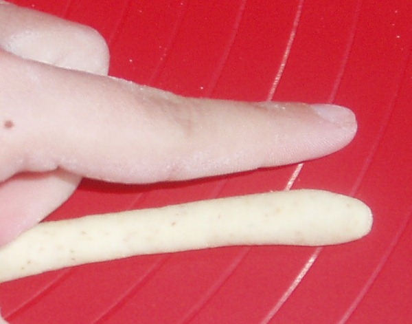 Ora viene il bello! Con un coltello “che non taglia” con la punta arrotondata (se non lo avete, potrebbe andar bene anche uno da bistecca, solo non fatevi aiutare dai bambini in questo caso!) tagliate dei piccoli pezzi (come a voler ottenere dei cubetti di pasta) e … spero si capisca cosa dovete fare dal video perché davvero non saprei come altro spiegarvelo!!! ahahaahahah