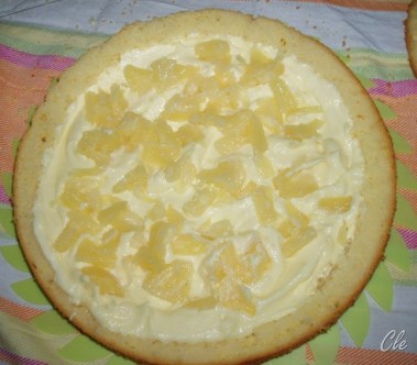 Creare la crema diplomatica (o chantilly) mischiando due parti di crema pasticcera e una parte di panna.Unire alla crema ottenuta l’ananas spezzettato e sgocciolato.