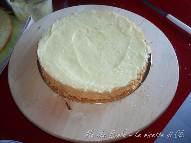 Bagnare anche il disco di pan di spagna rimasto e sovrapporlo alla torta. Ricoprire tutta la superficie e i bordi del dolce con la crema rimasta.