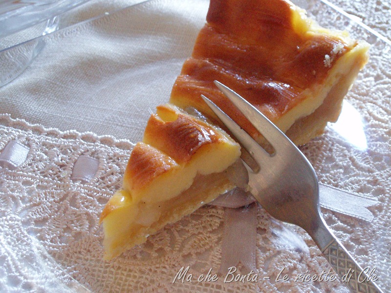 Montaggio del dolce: stendere la frolla in una sfoglia di circa 1/2 cm e foderare il fondo e i bordi di uno stampo da crostata già imburrato (o in alternativa più stampi da crostatina). Riempire fino a metà altezza con la composta di pere, quindi sigillare con una spirale di crema, cercando di ricoprire tutta la superficie del dolce.