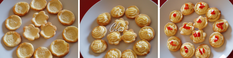 Avete letto bene, quelli che vedete sono pasticcini salati, base di brisée farcita con crema pasticcera salata e decorazione di peperoni in agrodolce.