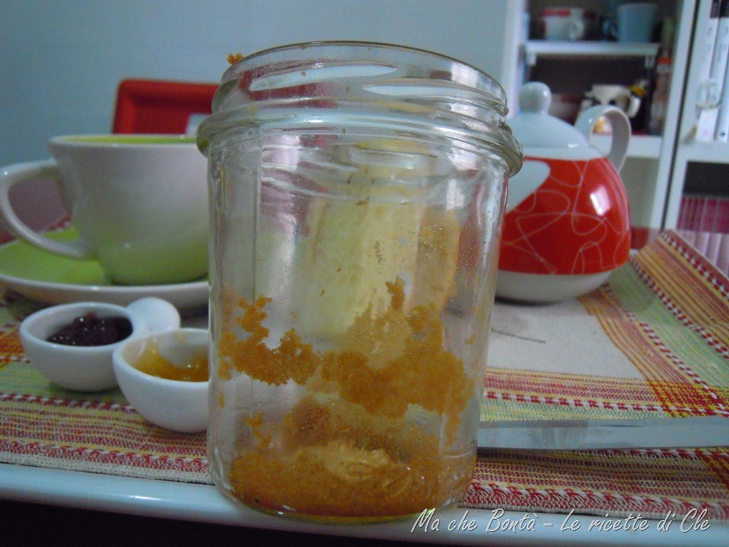 Di cosa si tratta? Si tratta di cuocere l’impasto dentro un vasetto di vetro (di forma regolare, svasato, con la bocca più larga del fondo, come questi) e di richiuderlo con il proprio tappo ermetico non appena sfornato.