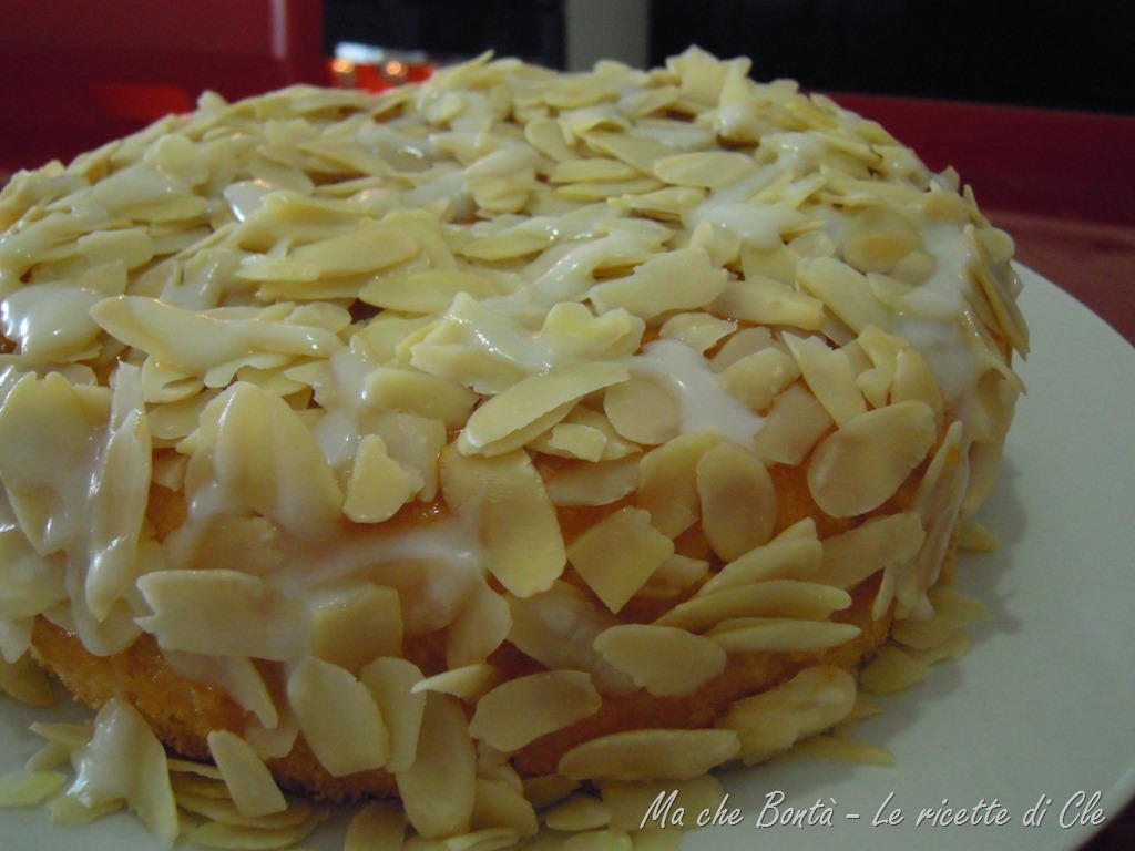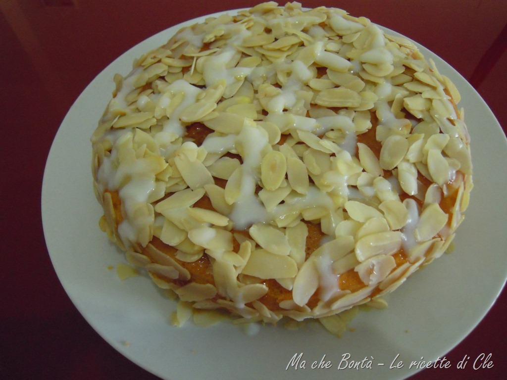 Ricoprire la superficie e i bordi del dolce con un sottile strato di confettura di albicocche e farvi aderire le mandorle a lamelle.