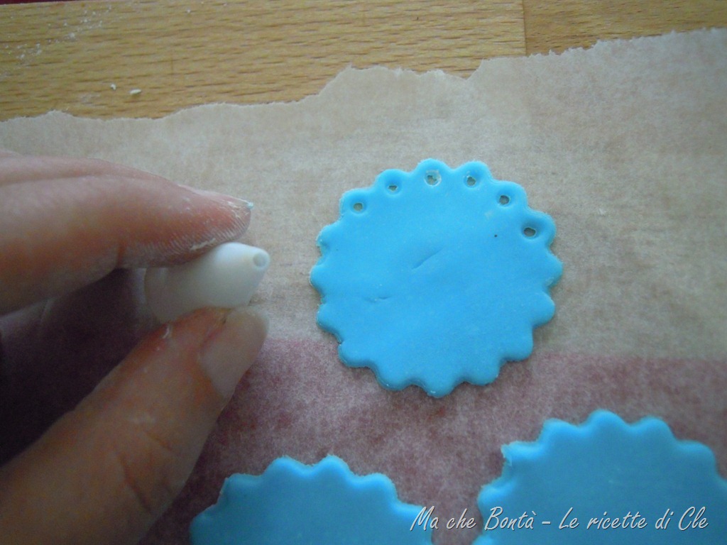 Creiamo il merletto: tagliamo la pasta di zucchero celeste e decoriamo il bordo (Cut the sugarpaste with the cookie mold and cut out a small hole in heach scallops):