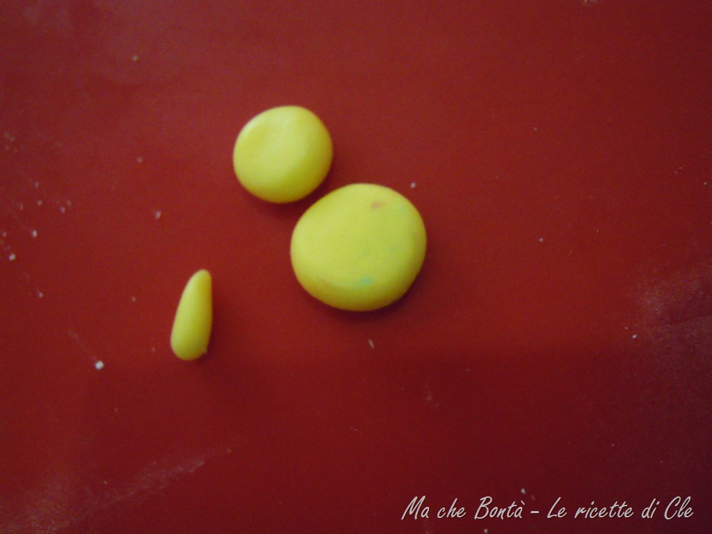 Per ogni pulcino servirà: una pallina gialla piccola schiacciata (testa), una pallina gialla un po’ più grande schiacciata (corpo), una micro pallina allungata (ala), una virgola arancio (becco). (For heach chick you need: three yellow small balls, of different size, the largest, flattened with finger, for the body, the medium, flattened too, for the head and the smaller, rolled into a tiny teardrop, for the wing).