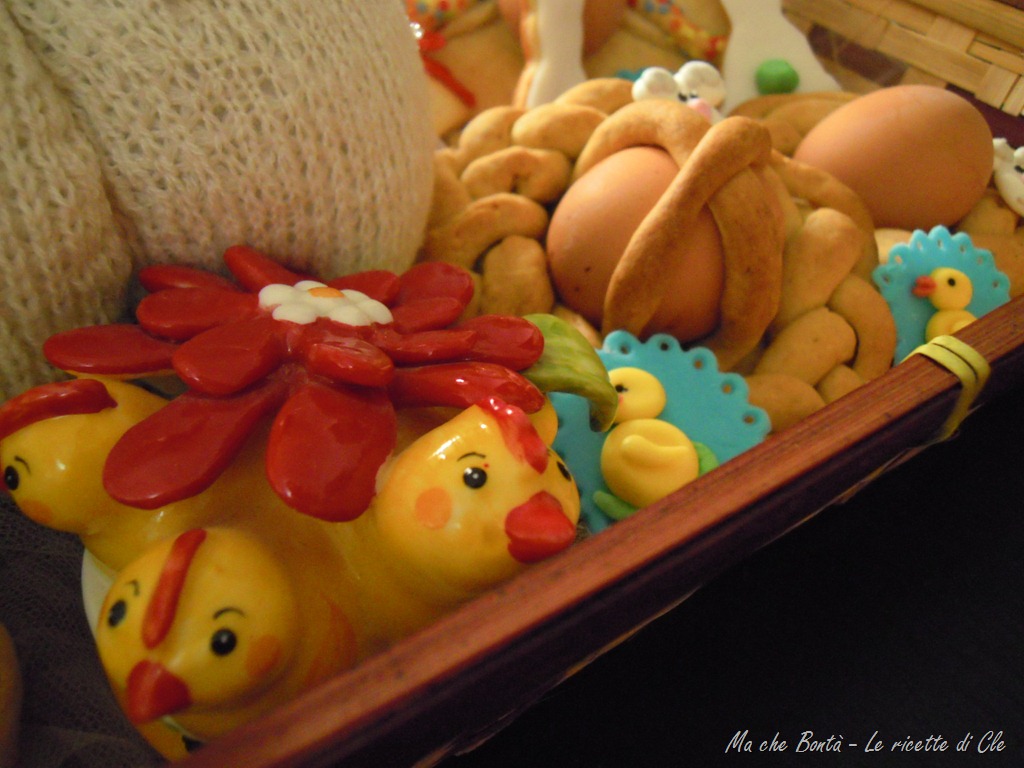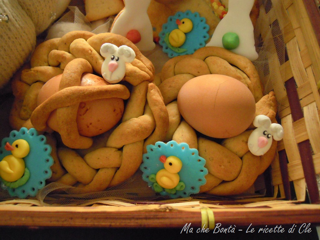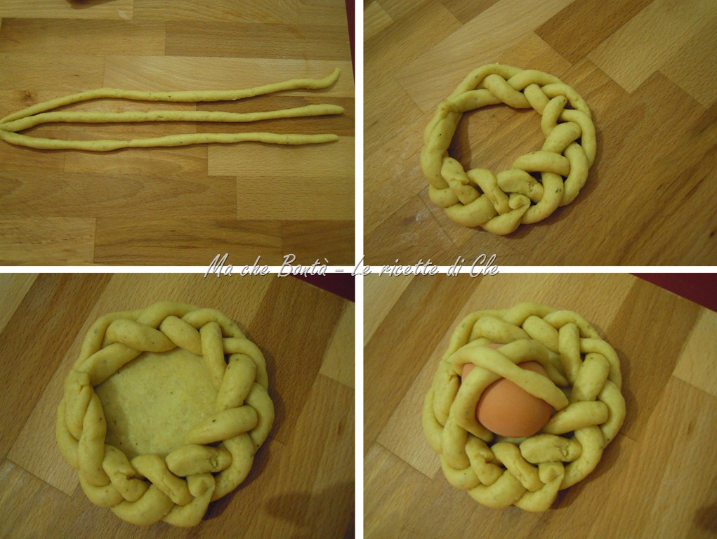 - Lasciar riposare l’impasto una ventina di minuti, quindi dargli la forma che preferite. Ad esempio io ho creato una base piatta e creato una treccia come bordo formando una specie di nido. A piacere decorate con le uova che potrete fermare con la tipica croce di pasta.