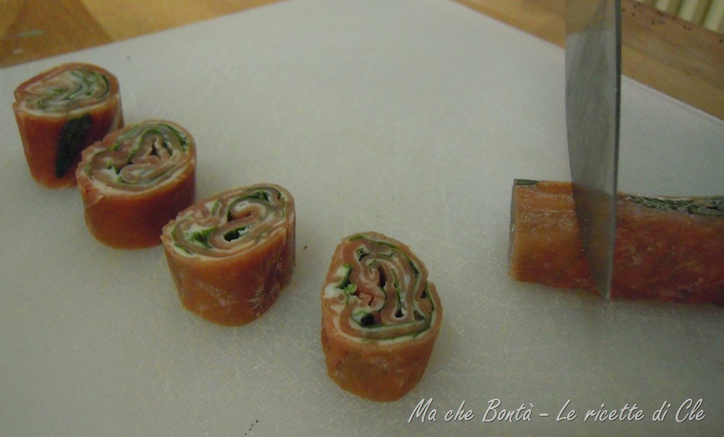 Comporre le minipiadine: Tagliare il “salamino” di prosciutto in rotolini alti circa un centimetro e mezzo: l’averlo congelato vi consentirà di mantenere la forma cilindrica durante il taglio. (Compose the mini piadinas: Cut the wrapped ham into 1,5 cm rolls. Since it is frozen it will mantain the round shape)