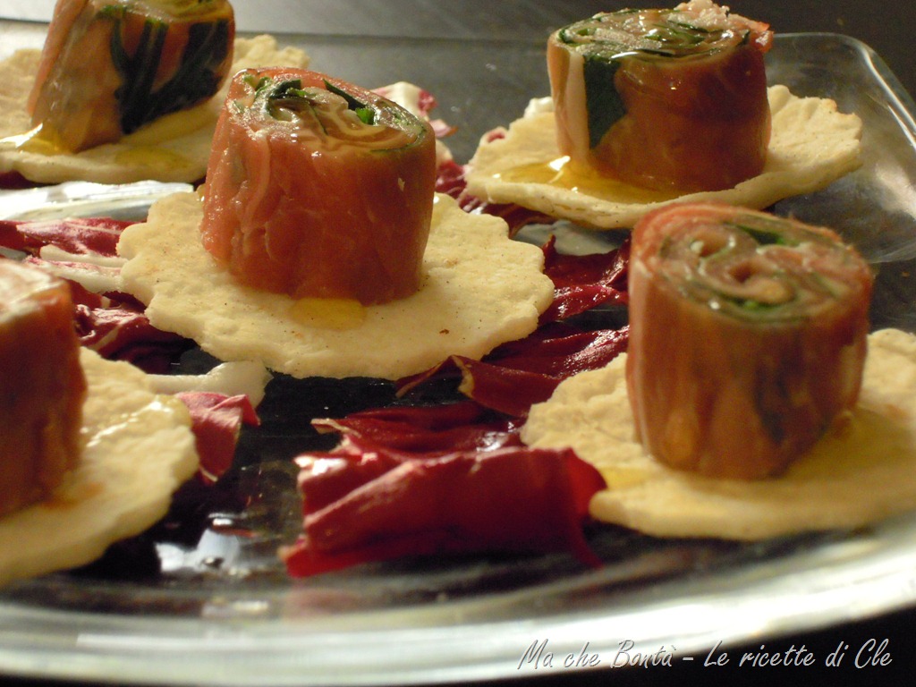 Niente di rivoluzionario nel gusto o negli accostamenti, ma una tecnica molto interessante per gestire degli ingredienti difficili da inserire su un mignon (fette di prosciutto, rucola…) e anche un modo per lavorare d’anticipo per la preparazione di un buffet.