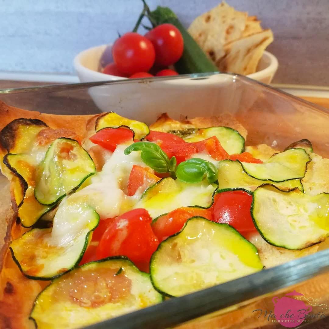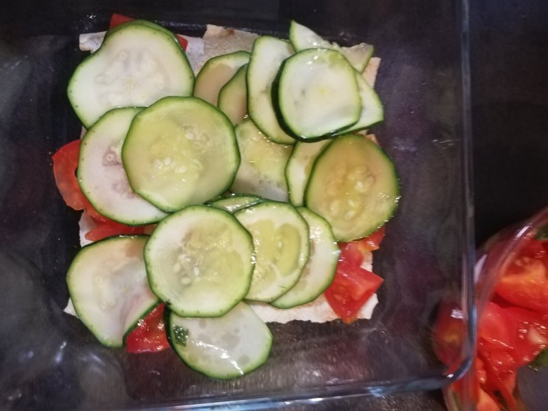Prendete una teglia da forno, ungetela con un filo d’olio, poi fate uno strato di pane carasau spezzettato. A piacere bagnatelo leggermente con dell’acqua. Tuttavia se lo preferite più croccante, l’acqua rilasciata dalle verdure darà (secondo me) la giusta consistenza. (In a tin alternate the carasau foils and the tomato, zucchini and cheese. Should you prefer the bread more crispy, do not wet it, the dressing juice will be enough. Then cover with other carasau bread and other tomatos, zucchini, cheese… se the photo).