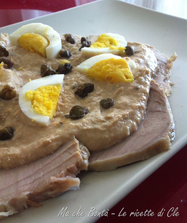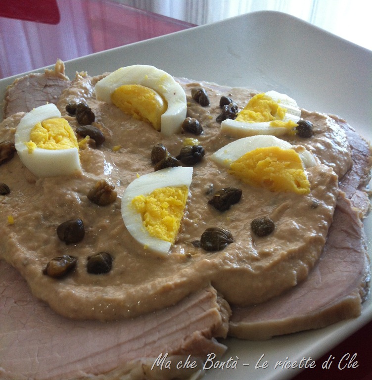Preparare la salsa: raccogliere in una ciotola il tonno sbriciolato, i capperi sciacquati e le acciughe. Condire con un filo d’olio ed unire 2 uova sode fatte a pezzettini. Frullate il tutto con un frullatore ad immersione sino ad ottenere una crema morbida. Unire a filo un po’ di brodo di cottura della carne e frullare ancora. Una volta pronta lasciar riposare in frigo, coperta con pellicola, per almeno mezz’ora.