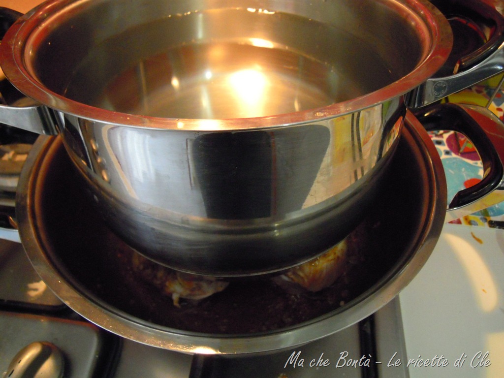 Let the chicken cook for 40 min. If needed add some water (little by little). - Girare le coscette e le ali per cuocere sul secondo lato, ricoprirle ancora con la pentola piena d’acqua per almeno altri 20 minuti.