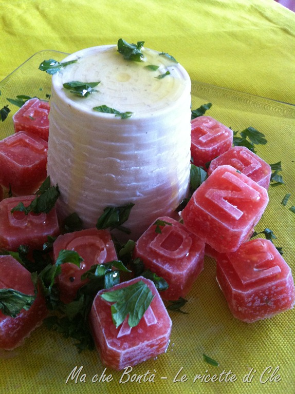 (Prepare the tomato gelée: peel the tomatos, remove the seeds and blend them. Heat a third part in the microwave and melt in it the icinglass. Add the remaining tomato juice, oil, salt, pepper and oregano. Pour in the semisphere mold – or in a squared pan – and put in the freezer. -