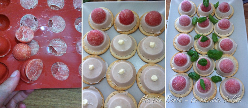 Colare il tutto negli stampini a forma di piccolo savarin o mini tartelletta e trasferire in congelatore per lameno 1 ora e 1/2 (si possono comunque preparare in anticipo e conservare in freezer per qualche settimana, stesso dicasi per la gelatina di pomodoro). Se non avete gli stampini per mignon, colate il tutto in stampini di alluminio monoporzione (tipo quelli da muffin).