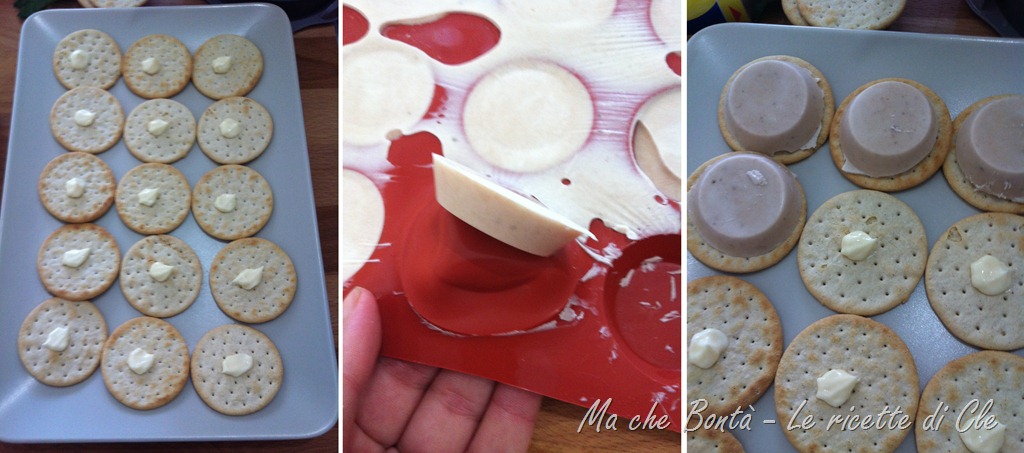 (Assemble the mignon: put on every cracker a little of maionese. Remove from the mold the frozen panna cotta an put it – when is still frozen – on the cracker).