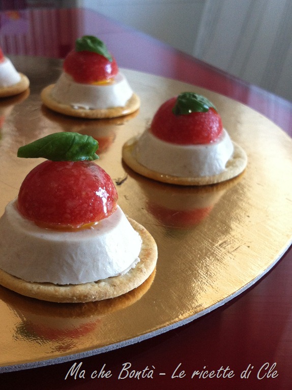 What are we talking about? what is this? Here it is on a round cracker a small tuna“panna cotta” and a tomato gelée. I propose you this fancy shape but, should you have not the right molds, I wil also show you a simple way to serve it! You can store them in the freezer and assemble them whenever you are guests for dinner! every body will love them, I assure you!