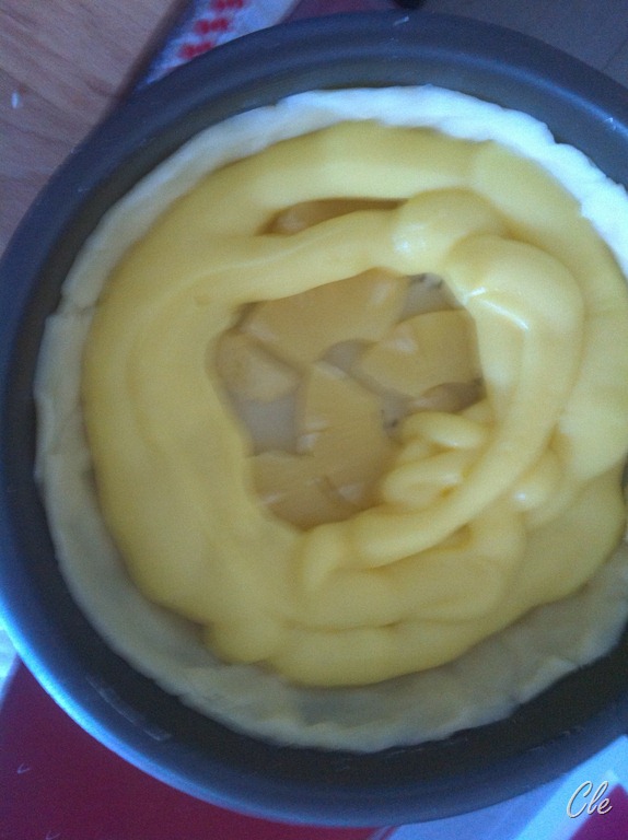 (In the meantime prepare the custard: let the milk and the cream boil. In the meantime whip the yolks with sugar, aromas and starch. Pour the milk into the mixture and stir. Let the crean boil stirring.) - Stendete la frolla con un mattarello dello spessore di 3 mm, Foderate con la frolla una tortiera del diametro di 22cm con bordo piuttosto alto. Bucherellate il fondo e mettervi dentro delle fettine di ananas sciroppato che avrete precedentemente tamponato su un canovaccio pulito. Ricoprite con la crema da forno (non occorre farla raffreddare!).