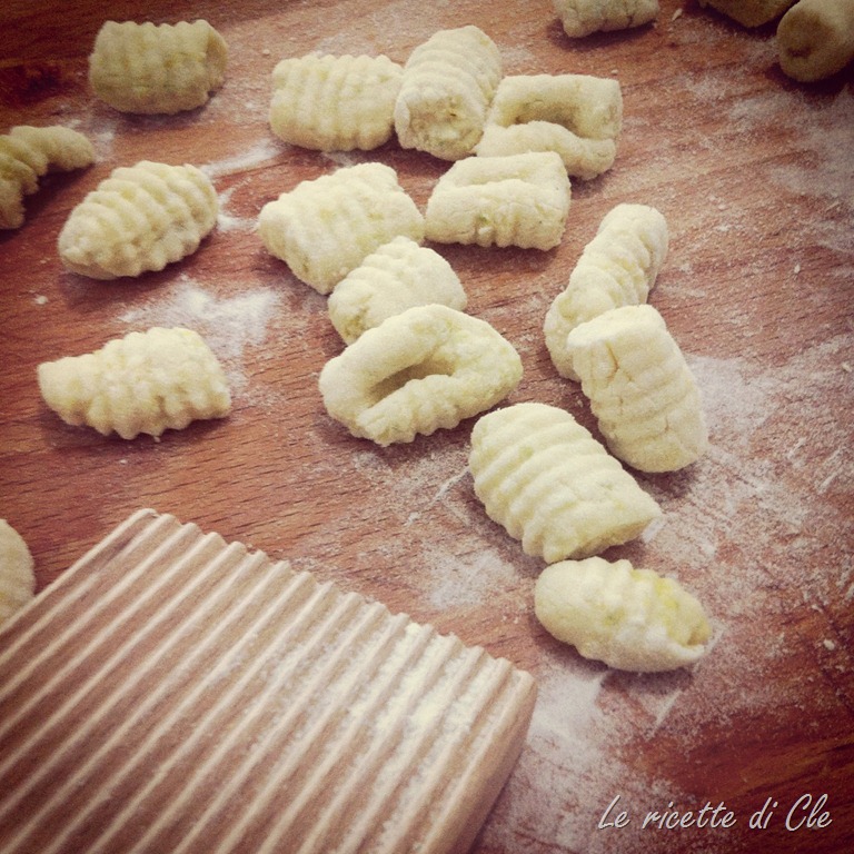 - Dividete l’impasto in cilindri spessi 1,5 cm e poi in tocchetti lunghi 2 cm. A piacere lasciateli lisci oppure passateli sui rebbi di una forchetta, sul retro di una grattugia o sull’apposito strumento in legno per rigare gli gnocchi. (Divide the dough in 1.5cm thick cilinders and cut 2cm long pieces . Should you like , pass them on a fork or upon the gnocchi maker)