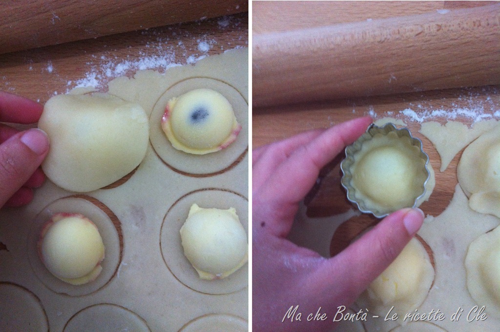 - Coprire ogni mezza sfera con i dischetti più grandi di pasta, sigillare i bordi con le dita, quindi rifinire con un coppapasta merlettato (o tondo) di 3 cm.