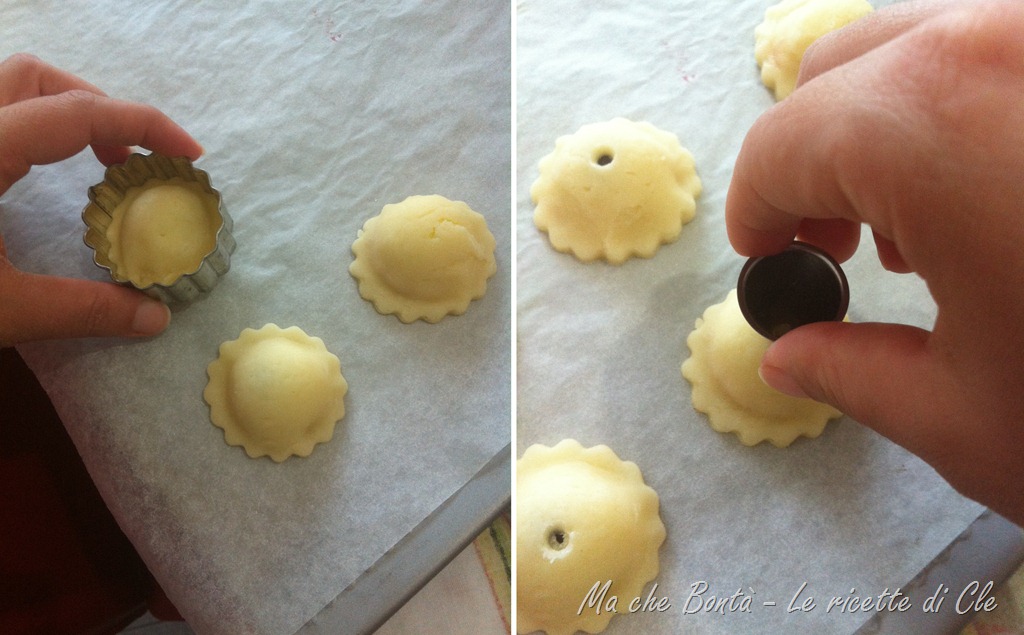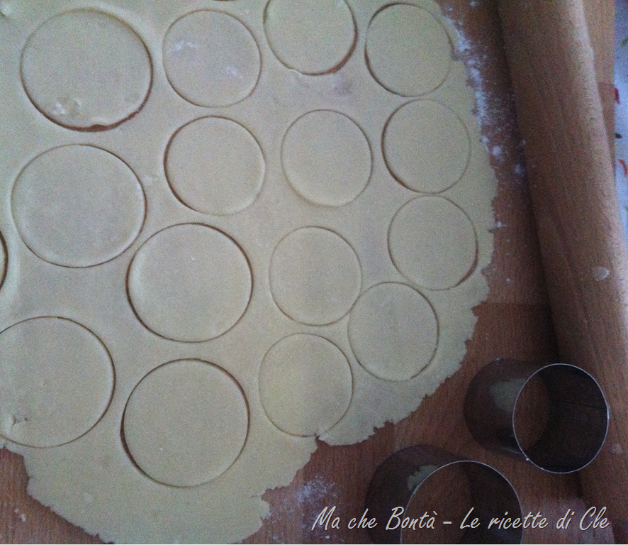 - Stendere la pasta frolla in una sfoglia di 2.5 mm. Utilizzando due diversi coppapasta, ricavate dei dischetti di diversa misura, di circa 3 e 4 cm di diametro (Montersino suggerisce di utilizzare la stessa misura per tutti i dischetti, ma io trovo che utilizzando due diverse misure si ottenga un risultato “casalingo” più preciso)