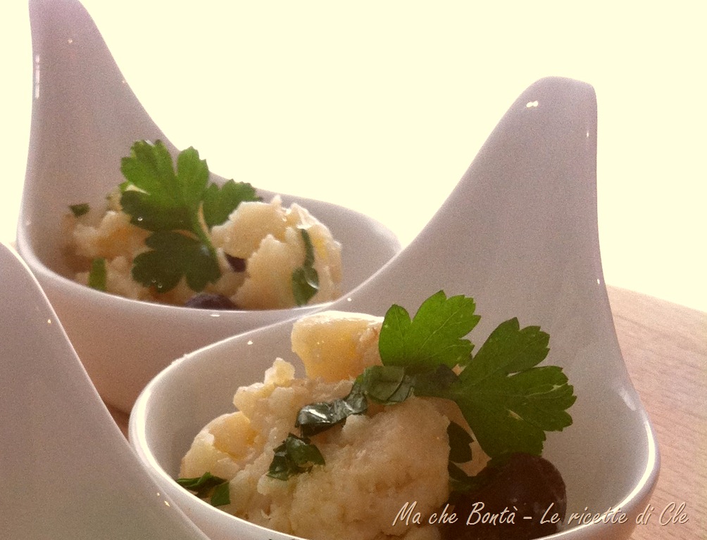 (Clean the cauliflower, core it and cut in little pieces) - Fate imbiondire l’aglio con l’olio in una casseruola, aggiungete il cavolfiore e saltare a fuoco vivo. Dopo 5 min aggiungere le olive.