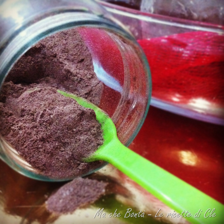 (Using a cutter pulverize the chocolate and the sugar. Should the chocolate will melt, put again into freezer.) - Setacciate in una ciotola il resto delle polveri, aggiungete il cioccolato con lo zucchero e suddividete il composto in barattoli. Per comodità di dosaggio cercate di fare dei barattoli di min. 110g di composto, max. 150g (o multipli).