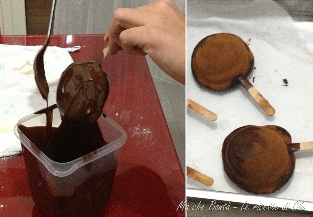 (When you want to serve the lollipop tiramisù prepare the chocolate icing: melt the chocolate in a bowl high enough to contain the biscuits. Mix the melted chocolate with some peanut oil or cocoa butter to avoit the icing to be too much thick or hard) - “Inzuppare” completamente i savoiardi da congelati nella copertura al cioccolato, lasciar scolare l’eccesso, quindi spolverarli di cacao e sistemateli su carta da forno giusto il tempo di far solidificare il cioccolato (pochissimi minuti). Dunque servire! Si scongelano in 10/15 minuti.