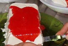 Nota estetica: questa è stata la prima volta in cui ho unito una parte di fragole a pezzetti nel culis di fragole, in passato ho sempre versato solo il culis di fragole (come nella foto a lato) ottenendo un effetto splatter poco accattivante. Inoltre evitate di far colare il rosso su tutti i bordi come se si fosse consumato un omicidio sulla vostra mattonella! Finite con un tocco di verde! Tutto questo dovrebbe aiutare a rendere la vostra mattonella più carina alla vista e non solo buonissima! ![]()