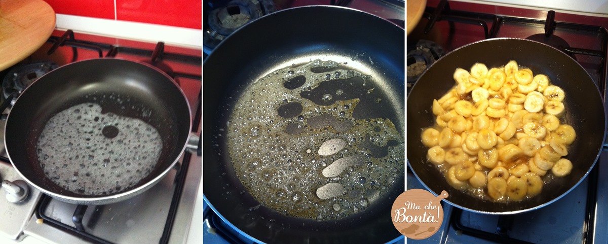 | 3. | Preparare il ripieno di banane caramellate: in una padella fate sciogliere lo zucchero con 1/2 tazzina d’acqua. Quando lo zucchero si sarà caramellato aggiungete il burro e le banane tagliate a rondelle. Fate insaporire per qualche minuto quindi sfumate con il rhum. | Prepare the caramelized bananas: heat the sugar with 2 tbs of water until it is caramelized. Add the butter and the bananas chopped in slices. Cook for some minutes then add the rhum and let it evaporate. |
