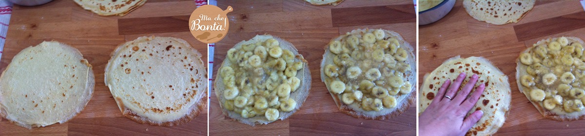 | 4. | Distribuite le banane caramellate su due crepes, coprite con altre due e mettete da parte. | Put the caramelized bananas on 2 crepes, cover with two other crepes and keep apart. |