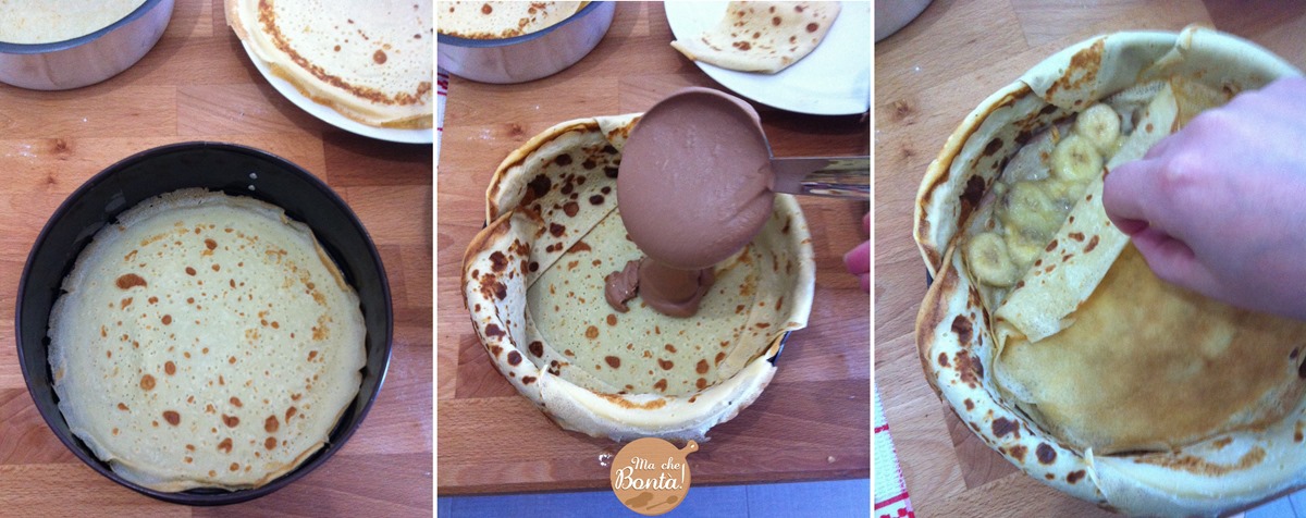 Scenario: Festa di compleanno in piena estate e non avete nessuna intenzione di accendere il forno. O non siete nella vostra cucina e non avete a disposizione un forno ben funzionante. Che si fa? Si va a comprare una torta in pasticceria? Certo che no! Due uova, una padella, qualche banana un po’ di cioccolata et voilà: una scenografica e golosissima torta di crepes, che piacerà a grandi e piccini. E se avete per casa qualche schizzinosetto che non gradisce i dolci alla frutta, basterà non dirgli che è un dolce con le banane: non se ne accorgerà nemmeno e chiederà il bis! Io stessa non ero una fan delle banane nei dolci, ma mi sono ricreduta dopo il primo assaggio!