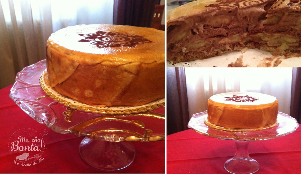 | 6. | A piacere terminare con uno strato di pan di spagna o savoiardi bagnati con amaretto che costituiranno poi il fondo della torta. Richiudere all’interno i bordi delle crepes che fuoriuscivano dallo stampo, ricoprire tutto con pellicola e trasferire in freezer o in frigo per far compattare bene il tutto. In freezer può essere conservata diverse settimane prima del servizio. | Should you like to, the last layer could be made with sponge cake soaked with almond liqueur. Fold the crepes toword the centre of the cake, cover with clingfilm and put in freezer or fridge for some hours (you can store in freezer also for some weeks, if you need to). |