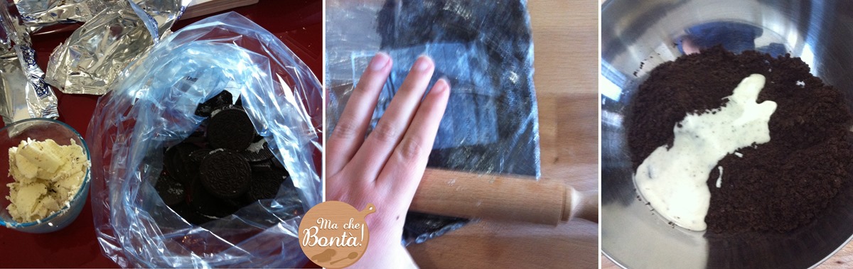 Crush 20 cookies to form fine crumbs; . Mix crushed cookies with butter (half dosage than biscuits); Some recipes suggest to separate the cream from the cookies… but I think it is not necessary and it is also very boring to do! |