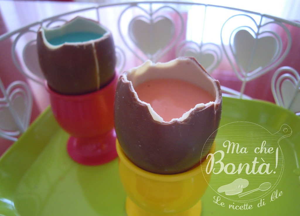 Supereasy and quick recipe… Actually this is not a recipe, maybe a hint! Should you are looking for an easy, fast, simple and funny party favour for Easter or just a little surprise for your kids but you are not so good in baking: here is the right idea for you: open some chocolate eggs and fill with coloured panna cotta! Done! You can find the panna cotta mix in every grocery too! So… no excuses! Have fun with your kids!