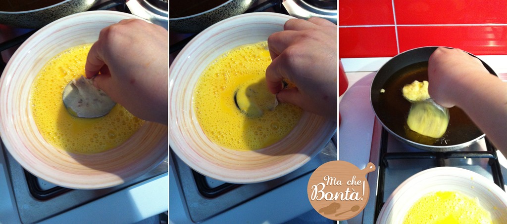 | 4. | Sciacquare le fette di melanzana e tamponarle. Scaldare l’olio. Infarinare le fette di melanzana poi passarle nell’uovo sbattuto e friggerle.Per organizzarvi meglio portatevi la scodella con l’uovo sbattuto vicino alla padella con l’olio, e passate le fette di melanzana nell’uovo prima di immergerle nell’olio poche per volta (vedi foto). | Rinse out the aubergine slices. Dust with flour then dunk in the beated eggs and fry. Be sure the oil is at the right tempeature. If not the aubergine will become a sponge and absorb a lot of oil. Prior to add any salt, taste them: likely the slices absorbed some salt yet. |