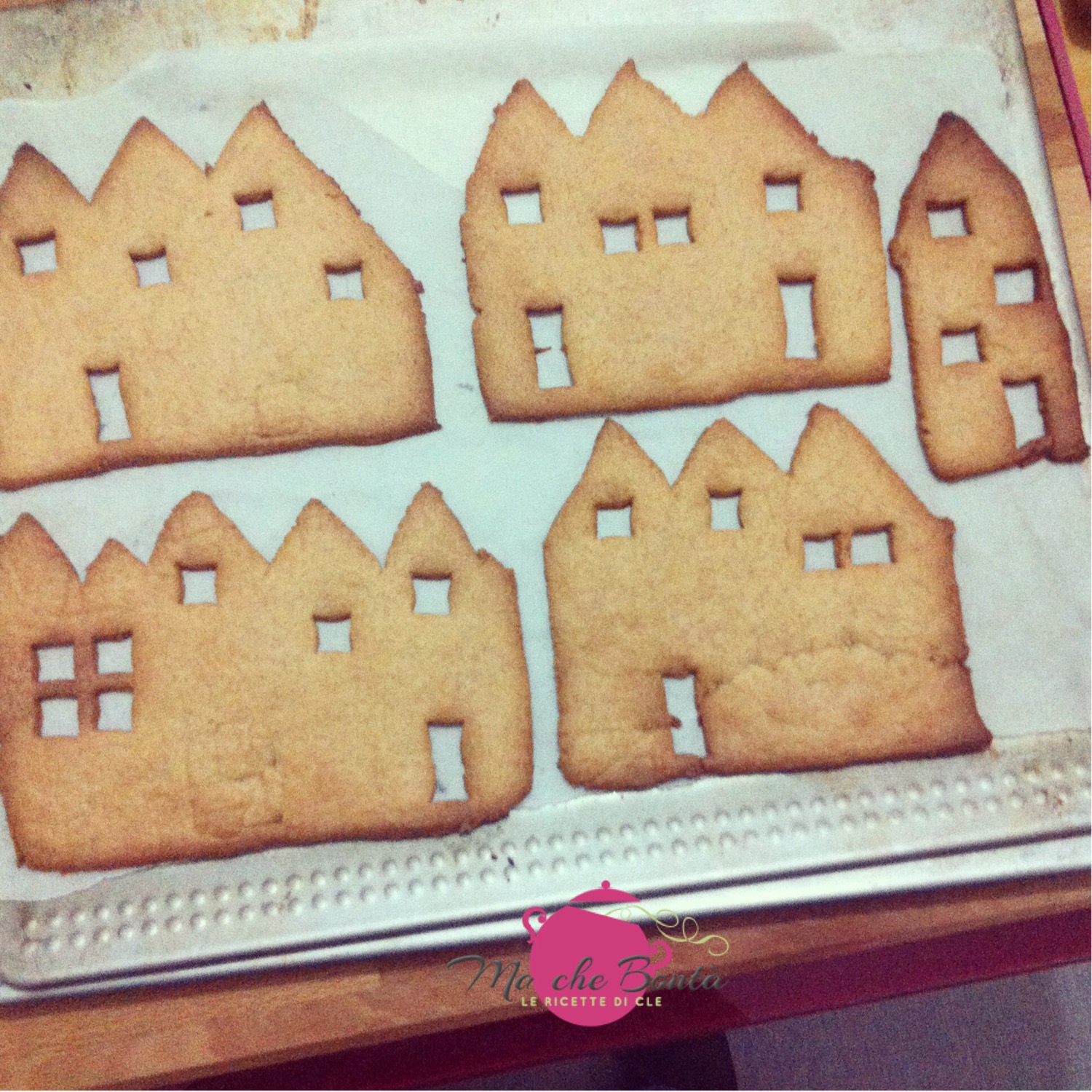 Come guida per sagomare la pasta frolla potete tranquillamente usare un cartoncino con base rettangolare su cui andrete a sistemare i tetti di varie dimensioni. Prima di infornare tagliate con un piccolo coppapasta quadrato o ovale le finestre e le porticine, qui e la.
