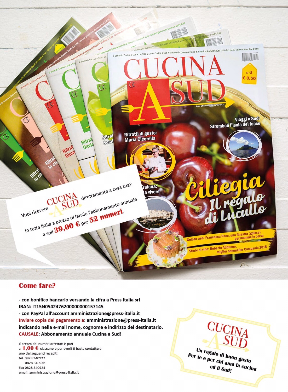Fuori dalla Campania potete ricevere la rivista in abbonamento oppure chiedere dei numeri arretrati, come da informazioni in fondo all’articolo, troverete tante ricette, itinerari gastronomici, interviste a famosi e promettenti chef come anche qualche spunto dal web, come la mia intervista. Potete anche seguire Cucina A Sud su Facebook e/o su Instagram, vedrete che vi verrà voglia di abbonarvi in un baleno!