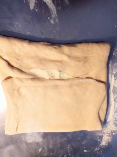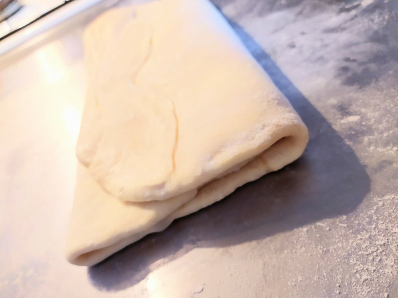 - Quindi procedere con le pieghe. Per capire meglio come fare le pieghe, potete fare riferimento alle foto sotto oppure alla videoricetta dei croissant (dal min. 2.40). Tenete conto però che si fanno solo le prime due pieghe (una a 4 e una a 3. Fare prima l’una o l’altra è indifferente).