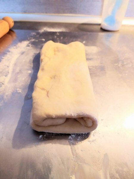 Stendete la sfoglia con il mattarello in uno strato di circa un centimetro e fate la prima piega a 4.