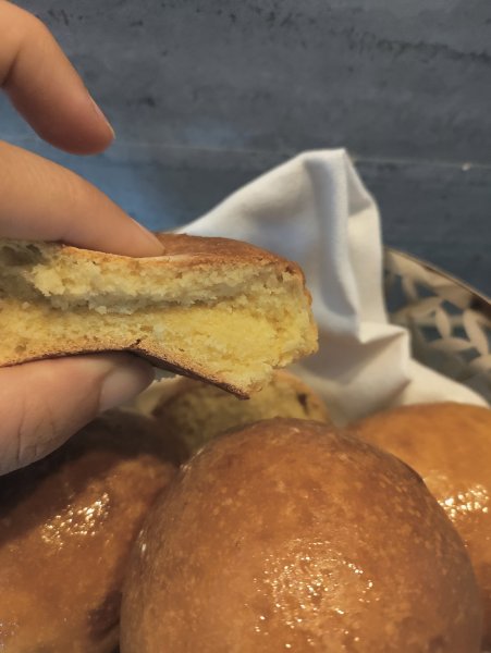 - Prima di infornare, a piacere, spennellare con tuorlo e panna (o latte), mischiate in pari peso (pesate il tuorlo e aggiungete lo stesso peso di latte o panna). Io generalmente ometto la spennellatura.