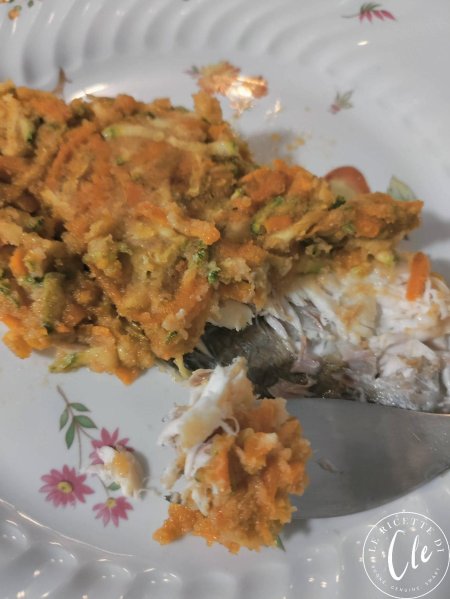 - Mettere il pesce, con la pelle rivolta verso il basso, in una teglia ricoperta da carta da forno. Salare leggermente. Distribuire il composto di verdure grattugiate sopra i filetti pressandolo con le mani per farlo aderire bene.