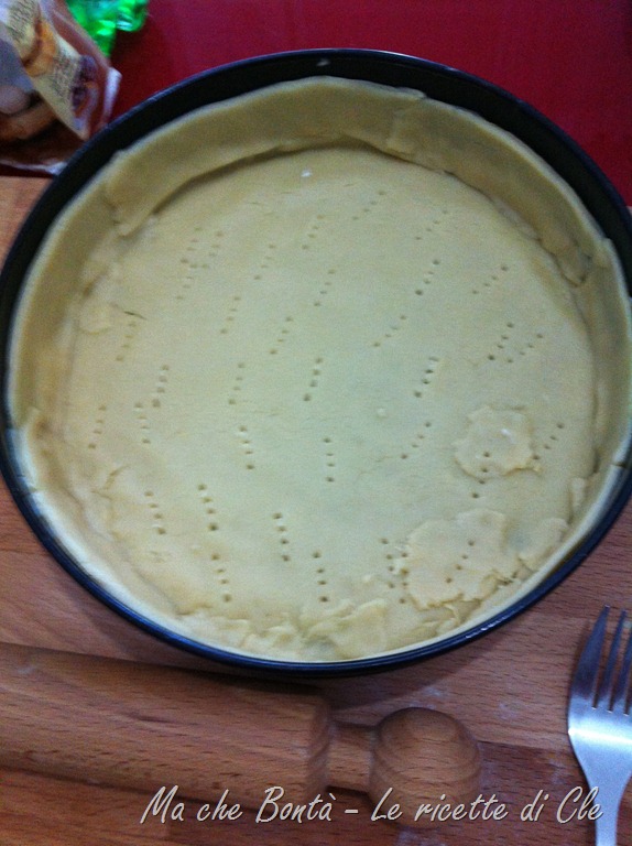• Fate aderire bene la frolla al fondo e alle pareti dello stampo, quindi tagliate la parte in eccesso sui bordi. A piacere decorate il bordo dello stampo con una forchetta oppure con un tappo di bottiglia per ottenere una bordura tipo quella della foto che vedete in cima al post.