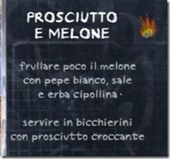 PM3_thumb2PM1_thumb1) Un bicchierino da bere in uno shoot con frullato di melone e aromi e prosciutto reso croccante in forno e spezzettato nel bicchierino. 2) fare dei cubetti di melone piuttosto regolari ed avvolgerli nel prosciutto. 3) Asciugare il prosciutto in forno e polverizzarlo nel mixer e usarlo per pralinare delle palline di melone!!!