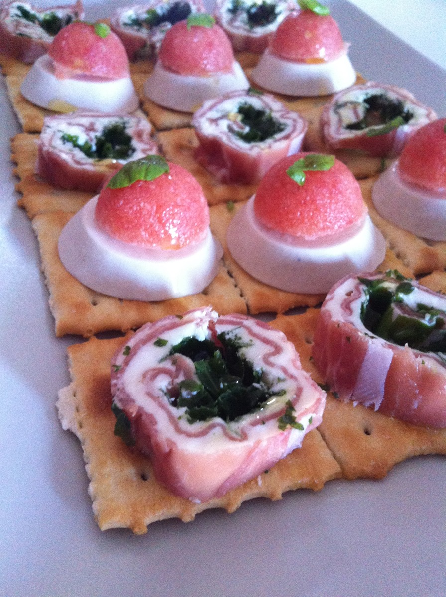 Antipasto: freschezza estiva (al prosciutto), minipiadine al carpaccio, salmone con panna acida